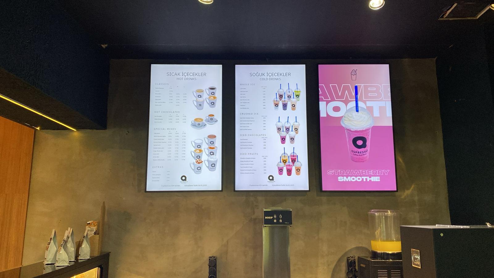 Q Espresso, misafirlerine yenilikçi, modern ve interaktif bir kahve deneyimi sunmak için şubelerinde Dora Teknoloji dijital menüboard çözümlerini tercih etti.